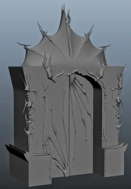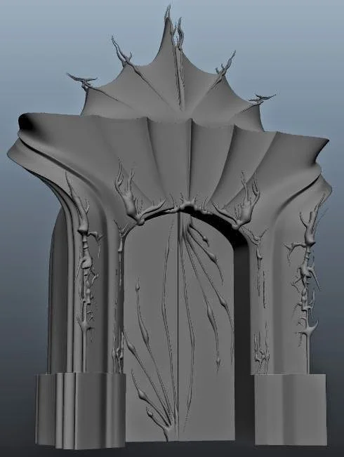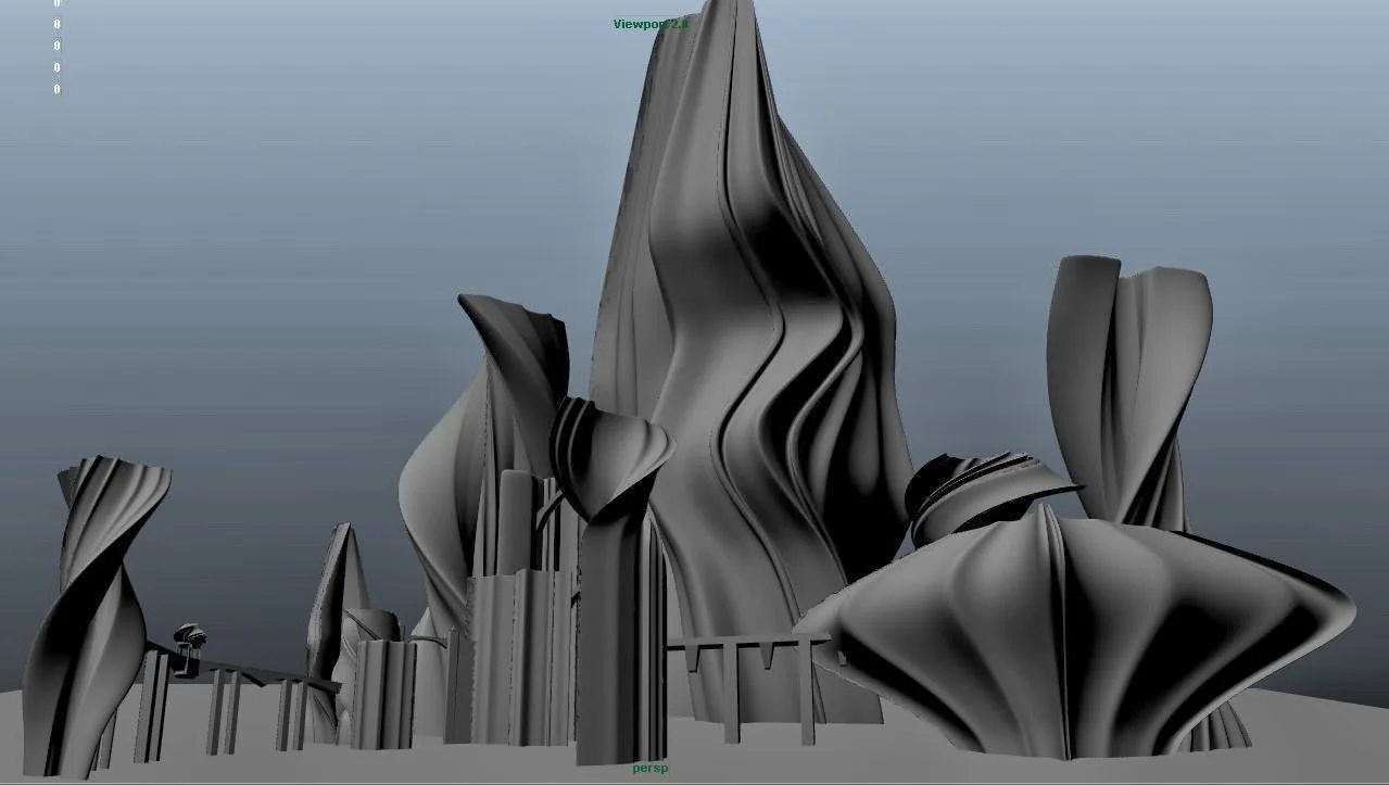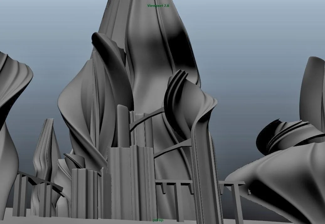The final model of the gate looked a little ‘stale’ considering the process I went through to get to it. I went back into maya. Using bat silhouettes and extruding them up and twisting them around came up with some really interesting shapes which I incorporated into the design. Which also inspired the building shapes for the city.